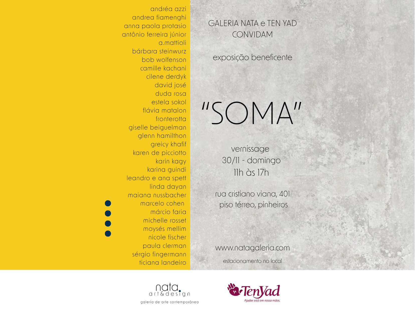 “SOMA” parte da ideia de que reunir diferentes vozes, estéticas e suportes gera uma força simbólica que transcende o individual e reverbera no coletivo — formando uma rede de afetos, imagens e ações. Parte da renda obtida com a venda das obras será destinada ao TEN YAD, organização que há mais de 30 anos atua no combate à fome e na promoção da dignidade de pessoas em situação de vulnerabilidade.